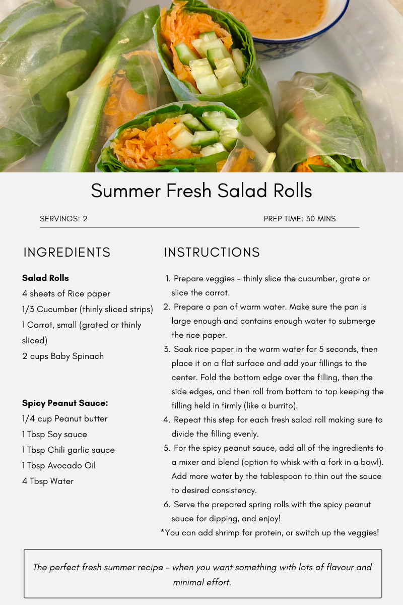 A fresh and healthy summer meal or appetizer that doesn’t require any cooking! You can personalize these rolls to add your own flavour, or keep it simple and let the spicy peanut sauce do the talking. This is a favourite summer recipe to keep you cool in the kitchen.